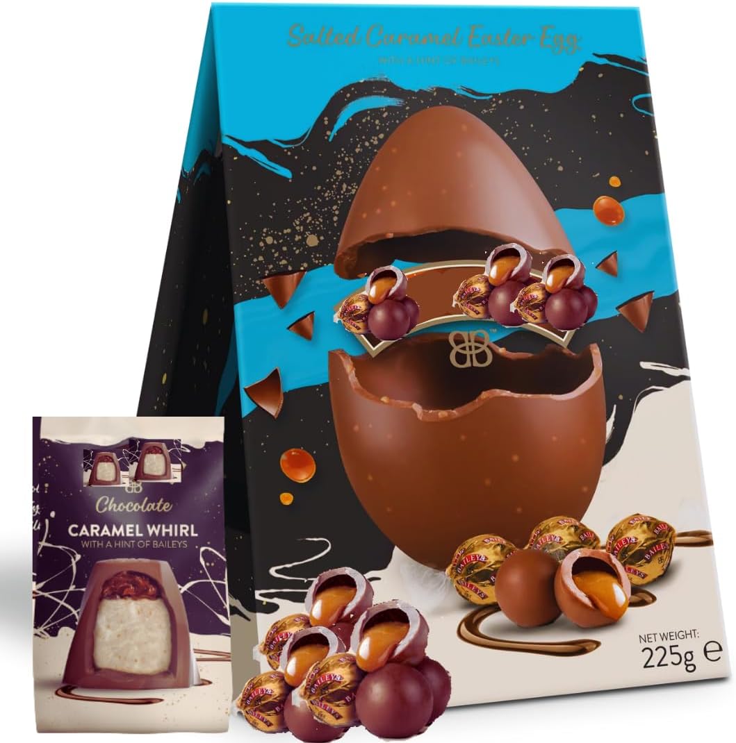 • BAILEYS CHOCOLATES WITH SALTED CARAMEL INDULGENCE Experience creamy Bailys chocolate blended with rich salted caramel and premium cocoa. A luxurious treat made for those who enjoy adult chocolate flavours and sophisticated Easter eggs.
